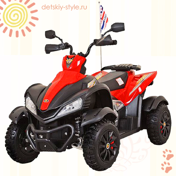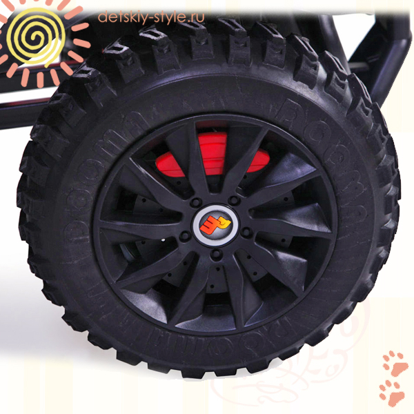 Массивная вместительных размеров ходовая база отлично приподнимает квадроцикл, делая его проходимость максимально высокой, при этом сами колеса, выполненные из износостойкой резины, отлично производят приоцесс сцепления электромобиля с дорожной поверхностью любого качества и придания точности осуществления моментов маневрирования.